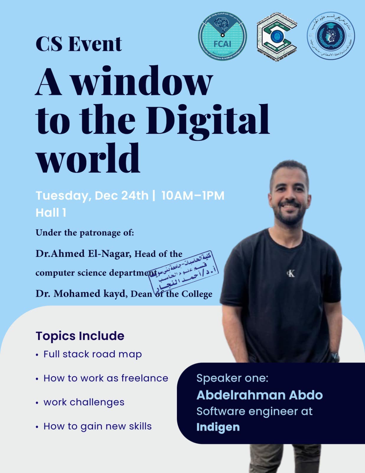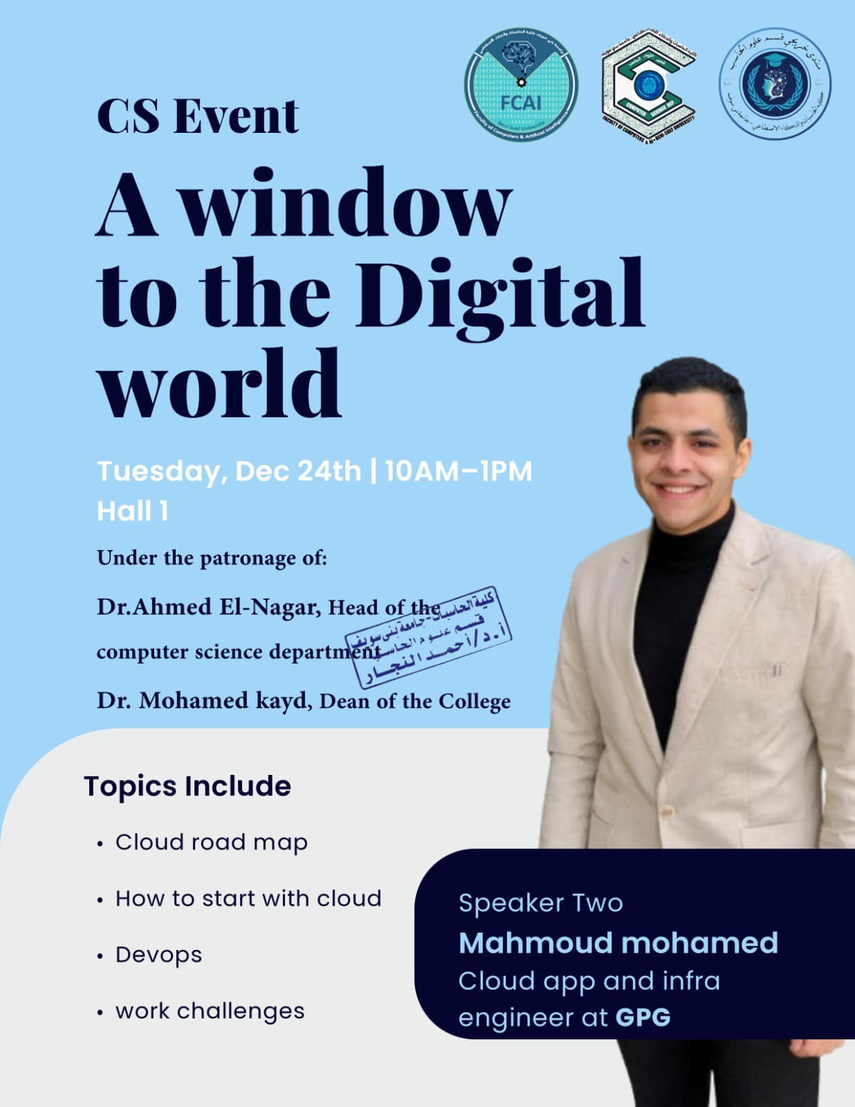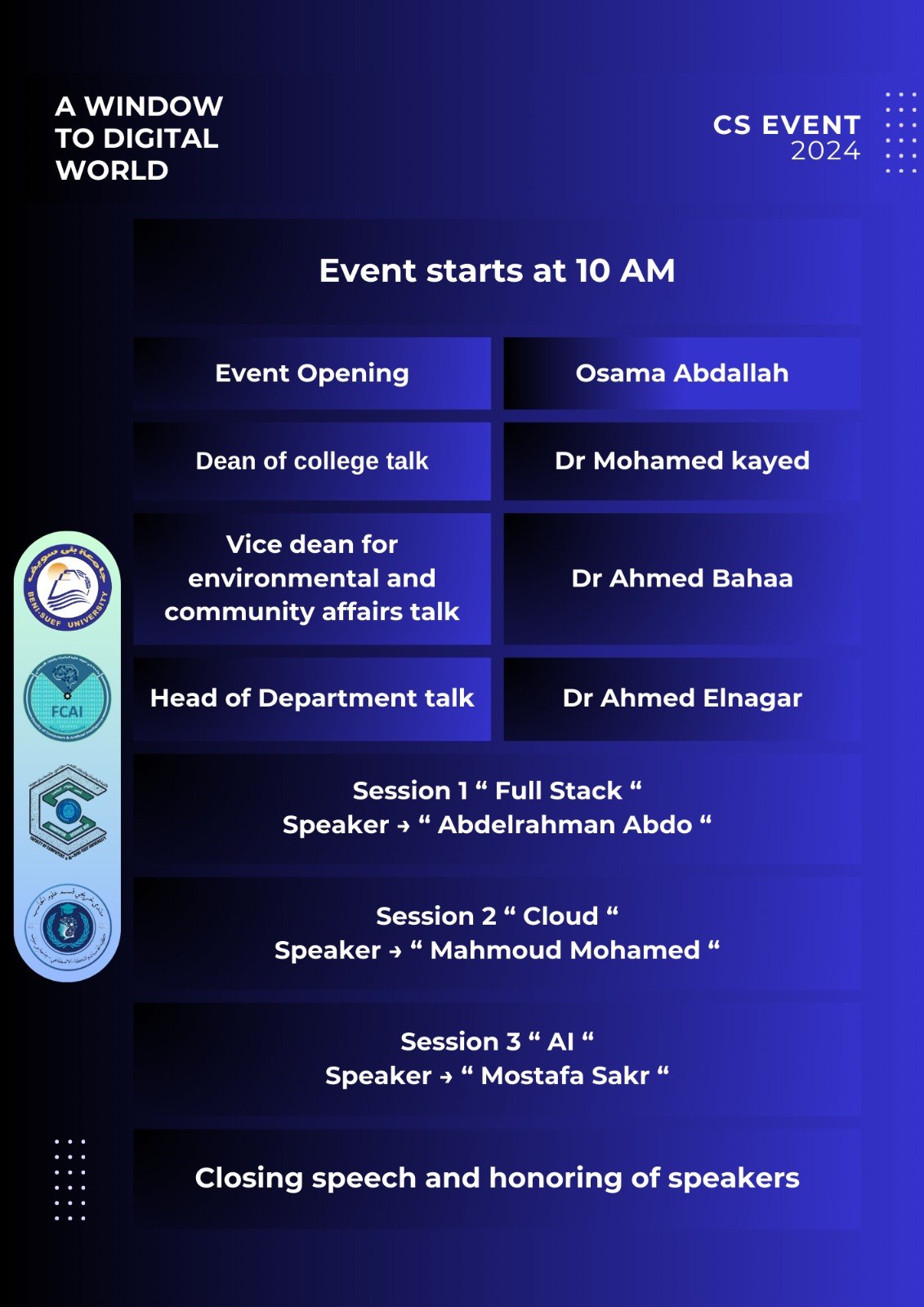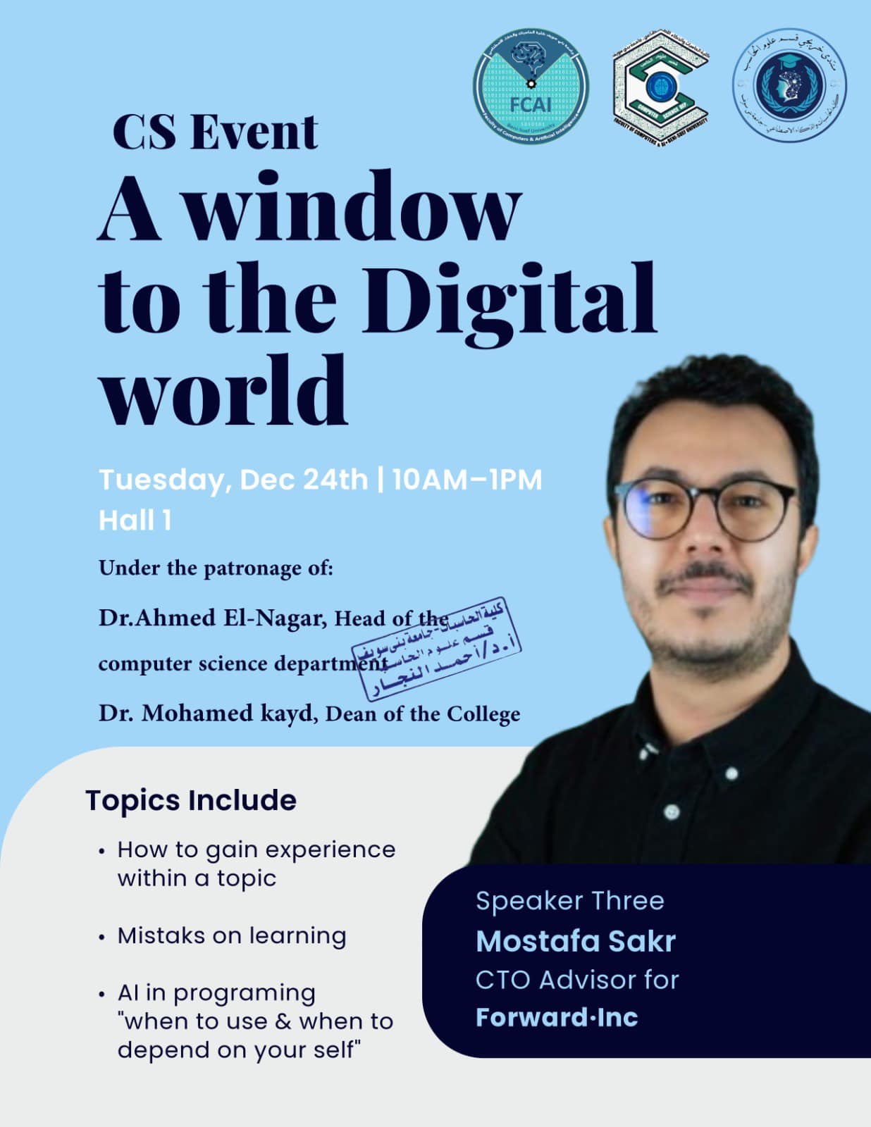 اول ورشة عمل بعنوان نافذه على العالم الرقمي في خطوة هي الأولى من نوعها، قام قسم علوم الحاسب بكلية الحاسبات والذكاء الاصطناعي بجامعة بني سويف بعقد أول ورشة عمل تحت مظلة "منتدى خريجي قسم علوم الحاسب" بعنوان "نافذة على العالم الرقمي". وكانت هذه الفعالية برعاية: رئيس جامعة بني سويف (ا.د منصور حسن). عميد كلية الحاسبات والذكاء الاصطناعي (ا.د محمد سيد قايد). وكيل الكلية لشئون المجتمع والبيئة (ا.د احمد بهاء). رئيس قسم علوم الحاسب(أ.م.د احمد النجار). وشارك في تقديم الورشة نخبة من خريجي ومهندسي الكلية المتميزين، الذين قدموا خبراتهم العملية وشاركوا تجاربهم الناجحة بعد التخرج، مما فتح آفاقًا جديدة للطلاب والخريجين نحو مستقبل رقمي واعد. وحاضر في هذه الورشة كلا من :- م.مصطفى صقر م.عبدالرحمن عبده م. محمود محمد